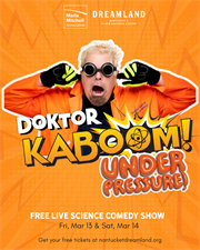 The Maria Mitchell Association, in collaboration with the Nantucket Dreamland, invites the community to two unforgettable and entertaining performances featuring Doktor Kaboom: Under Pressure!. Doktor Kaboom’s interactive Science Comedy shows engage audiences of all ages.