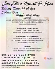Join Fato a Man on Saturday, March 14, at 6:00 PM at The Hive for our next Maker’s Meal. Experience traditional Italian cuisine from the Venice region right here on-island, served at a communal dinner.