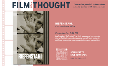 Film for Thought presents Riefenstahl, a documentary examining Leni Riefenstahl’s artistic legacy and her complex ties to the Nazi regime. Through archival footage and testimony, the film contrasts her self-portrayal with evidence of her awareness of the regime’s atrocities.