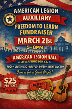 Freedom to Learn Fundraiser Join the American Legion Auxiliary for a great night filled with Food, Live Music, 50/50, Raffle, and Silent Auction. Images Gallery Image × Set a Reminder Enter your email address below to receive a reminder message. Email address Select the amount of Days before the event -- Select Days Before Event -- 1 Day 2 Days 3 Days 1 Week Captcha Validation Please complete the Captcha Submit Date and Time Saturday Mar 21, 2026 5:00 PM - 8:00 PM EDT Saturday March 21st, 5-8pm Location American Legion Hall 21 Washington St Fees/Admission $25 Per Ticket Set a Reminder Enter your email address below to receive a reminder message. Email address Select the amount of Days before the event -- Select Days Before Event -- 1 Day 2 Days 3 Days 1 Week Captcha Validation Please complete the Captcha Submit Share × Print Email Add to Calendar Facebook Twitter LinkedIn Tell a Friend × Select Calendar Type × Google Yahoo iCal (Outlook, Apple, or other)