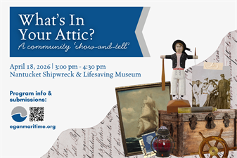 Egan Maritime Institute invites members of the community to showcase personal items connected to Nantucket’s maritime or general history. Selected local presenters* will bring an item to the museum and join Egan Maritime staff in a lively gam exploring its personal significance, historical context, and the stories it may hold. Plus, get an exclusive look at artifacts from the Shipwreck & Lifesaving Museum’s ‘attic’ (archival storage) that aren’t typically on display.